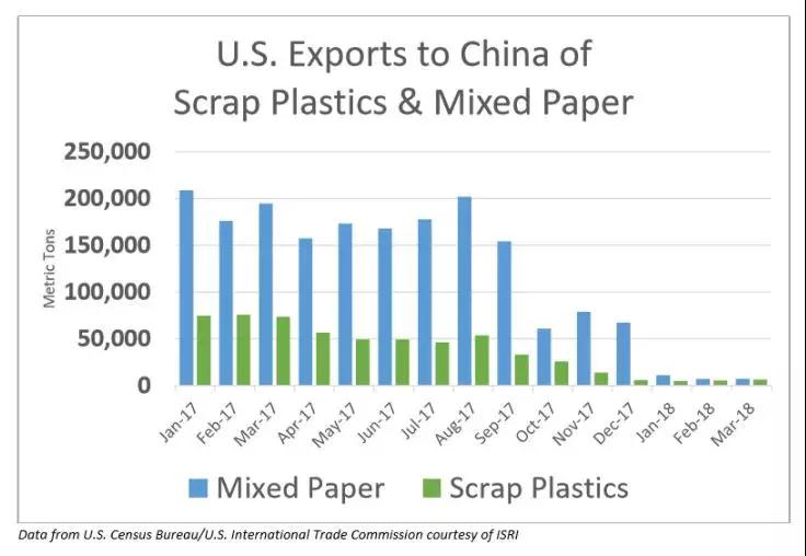 根據(jù)美國廢棄金屬工業(yè)協(xié)會提供的數(shù)據(jù),僅2016年一年,美國就向中國出口了高達143萬噸的塑料廢品和1320萬噸的紙質(zhì)廢品,總價值56億美元。
