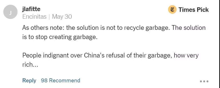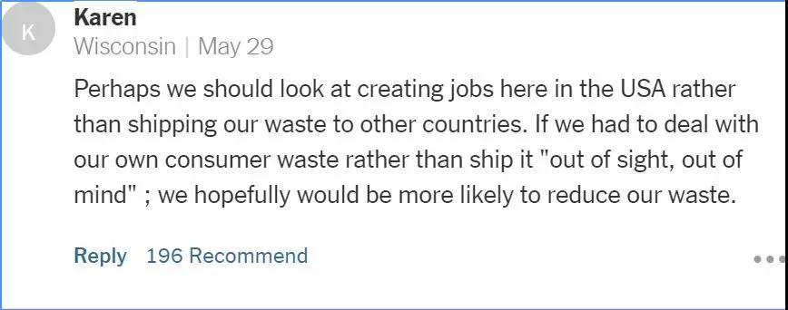 “我們應(yīng)該致力于在美國國內(nèi)創(chuàng)造更多的垃圾處理相關(guān)的就業(yè)崗位,而不是把垃圾轉(zhuǎn)運到其他國家。如果我們能意識到自行處理垃圾是件多么困難的事情的話,我們的浪費也就自然而然減少了?!?/p>