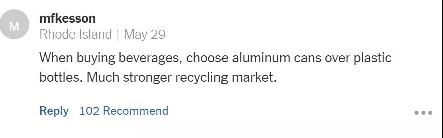 “當我們買飲料時,應(yīng)該盡量買那些鋁制罐裝的而不是塑料的。鋁材質(zhì)有著更強大的回收市場。”