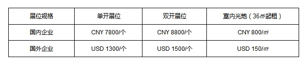 注:1、標準展位:高2.5米,提供三面圍板、中文楣板制作、洽談桌一張、折椅兩把、射燈兩只、10A/220V插座一個;