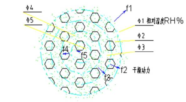 干燥動(dòng)力(f1~f5):就是物料中水份(或溶液)向物料外部的遷移(蒸發(fā))的能力。其處決于物料與相鄰物體的蒸汽分壓或相對(duì)濕度(RH)的差值,差值越大,其移動(dòng)或轉(zhuǎn)移的能力就越大。物體內(nèi)階梯型的相對(duì)濕度(φ1~φ5)逐漸增加,在φ1很小φ5很大時(shí),階梯的相對(duì)濕度(RH)的差值更趨明顯,水分遷移能力就很大。而當(dāng)φ1接近φ5時(shí), 階梯的相對(duì)濕度(RH)的差值減少,水分遷移能力(蒸發(fā)強(qiáng)度)就很小。這就是同等條件下,干燥設(shè)備內(nèi)物料水分較小時(shí),蒸發(fā)強(qiáng)度低的原因。