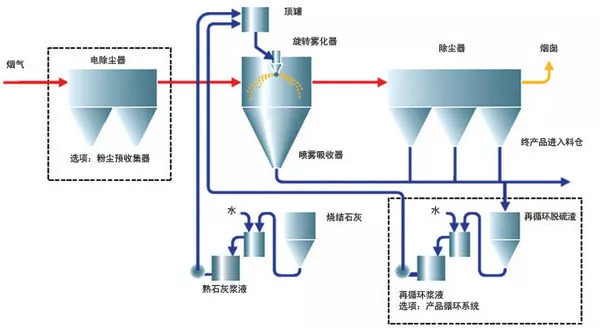 該脫酸方法為通過石灰漿制備系統(tǒng)將生石灰制備成石灰漿溶液,然后通過一個水泵加壓到一個高速旋轉(zhuǎn)的霧化器將霧化的溶液均勻注入反應(yīng)塔內(nèi)與塔內(nèi)流動的煙氣反應(yīng),去除酸性氣體。不做詳細解釋。