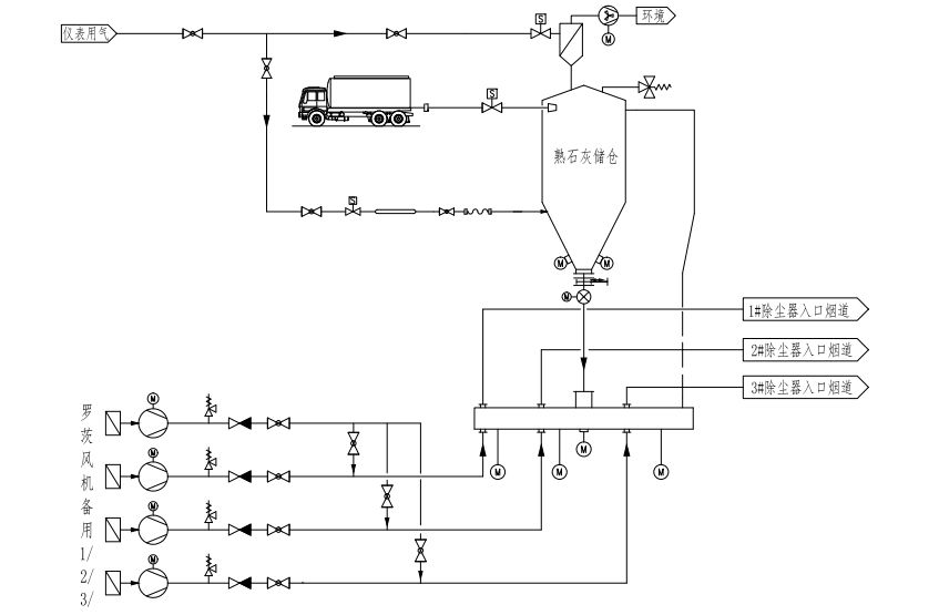 該脫酸方法是利用風(fēng)機的壓能將消石灰粉末噴射到反應(yīng)塔出口的煙道中,使得消石灰與煙道流過的煙氣中的酸性成分發(fā)生中和反應(yīng),去除酸性氣體。