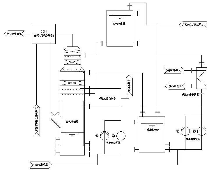 濕法脫酸工藝是利用堿性吸收劑(一般為NaOH溶液)在洗滌塔內(nèi)吸收HC1和SO2等酸性氣體。濕法凈化工藝凈化效率很高,國外多年的應(yīng)用業(yè)績均表明其對HC1的脫除效率可達99%以上,對SO2也可達到95%以上的脫除效率。但是濕法凈化工藝后續(xù)需要配置廢水處理設(shè)施,且處理后煙氣溫度一般為6O~70℃,為防止煙囪出口有“白煙”冒出,還需要配置煙氣再加熱裝置,在國內(nèi)還沒有應(yīng)用實例,可作為干法和半干法凈化工藝之后的尾氣深度凈化措施。