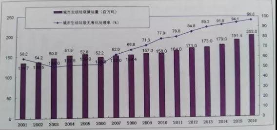 從1979年開始,隨著我國城市化的進(jìn)程,到2016年,我國城市化垃圾已經(jīng)到達(dá)兩億噸??梢钥吹剑覈鞘欣臒o害化處理在2016年已經(jīng)接近100%,可以說我國城市垃圾的無害化處理取得的成績還是非常顯著的。
