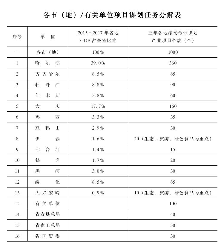 3.落實產(chǎn)業(yè)項目謀劃任務(wù)。堅持產(chǎn)業(yè)項目謀劃與各地經(jīng)濟(jì)規(guī)模相匹配原則,哈爾濱、大慶、齊齊哈爾、牡丹江、佳木斯、綏化等主要城市在項目謀劃上要有更大擔(dān)當(dāng),更好的發(fā)揮省會城市示范作用、釋放中心城市帶動作用,激活周邊區(qū)域要素,促進(jìn)區(qū)域協(xié)同發(fā)展。資源型地區(qū)要強(qiáng)化轉(zhuǎn)型發(fā)展,煤城突出現(xiàn)代煤化工和非煤替代產(chǎn)業(yè)項目謀劃工作,林區(qū)突出生態(tài)旅游、林下資源開發(fā)、綠色有機(jī)食品等項目儲備。沿邊地區(qū)要發(fā)揮地緣優(yōu)勢,突出開發(fā)外向型產(chǎn)業(yè)項目。按照各地2015年至2017年經(jīng)濟(jì)總量占全省的比重,并考慮各地間的適度均衡,確定各地三年謀劃產(chǎn)業(yè)項目最低目標(biāo),鼓勵各地超額完成任務(wù)。