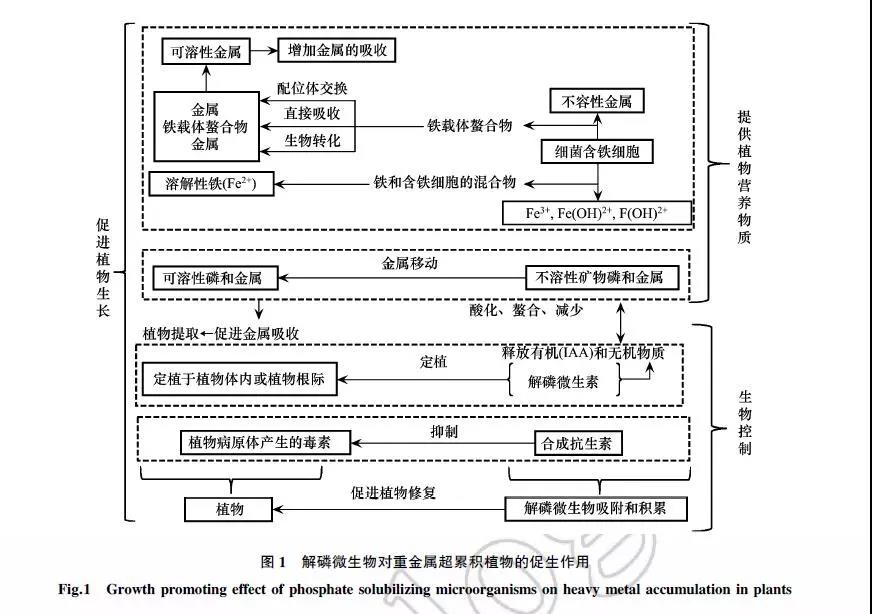 因此,解磷微生物對(duì)土壤中的重金屬起到雙向調(diào)節(jié)的作用,相對(duì)應(yīng)的就有兩種修復(fù)機(jī)制:①生物固定,包括微生物本身對(duì)重金屬的生物沉淀、吸附、細(xì)胞內(nèi)累積以及促進(jìn)重金屬的植物固定;②生物活化,通過(guò)提高重金屬的生物有效性,促進(jìn)重金屬的轉(zhuǎn)移并積累在植物組織中。但是生物固定僅改變了重金屬污染物在土壤中的賦存形式,并不能減少重金屬總量,而且穩(wěn)定劑聯(lián)合使用會(huì)對(duì)土壤理化性質(zhì)、微生物群落帶來(lái)一定的負(fù)面效應(yīng)。因此,解磷微生物與植物的聯(lián)合修復(fù)是一種被公眾認(rèn)可的環(huán)境友好型、生態(tài)可持續(xù)的修復(fù)方式,具有良好的應(yīng)用前景。