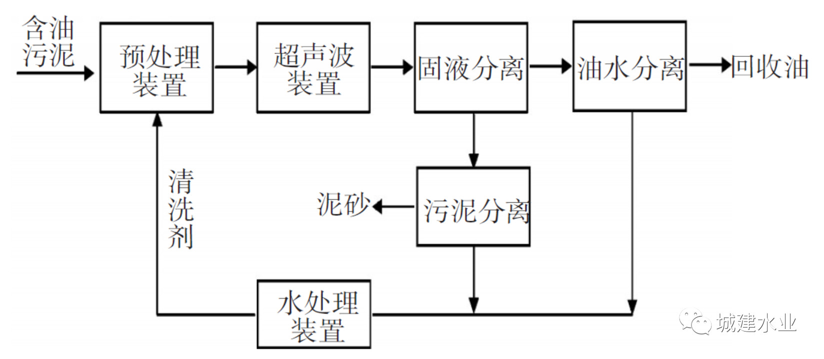 超聲處理技術(shù)是通過(guò)聲場(chǎng)的機(jī)械振動(dòng)、空化效應(yīng)及熱作用來(lái)破壞含油污泥的結(jié)構(gòu),降低污泥中原油的黏度,減小原油與無(wú)機(jī)固體間的黏附作用,從而使含油污泥中的油和泥砂分離。其工藝流程如圖3.5所示:①清洗劑預(yù)處理含油污泥;②超聲分離油泥,使原油與固體顆粒分離;③旋液分離器分離油水和泥砂,泥砂通過(guò)離心機(jī)脫水,油水經(jīng)分離器分離出油。