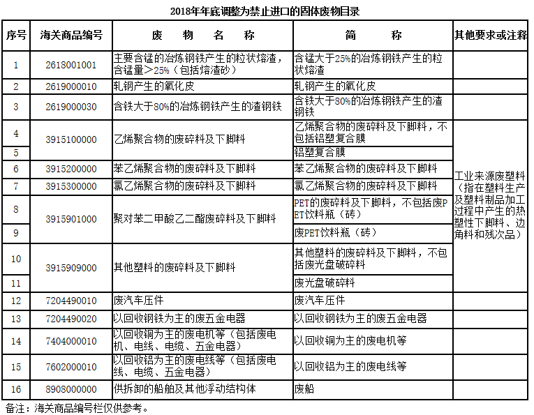 一、將廢五金類、廢船、廢汽車壓件、冶煉渣、工業(yè)來源廢塑料等16個品種固體廢物(見附件1),從《限制進口類可用作原料的固體廢物目錄》調入《禁止進口固體廢物目錄》,自2018年12月31日起執(zhí)行。