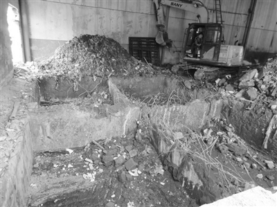 環(huán)境執(zhí)法人員在常熟市古里鉚焊廠有限公司表面處理車間內(nèi)開挖出表面設(shè)施下位池。黃駿 攝