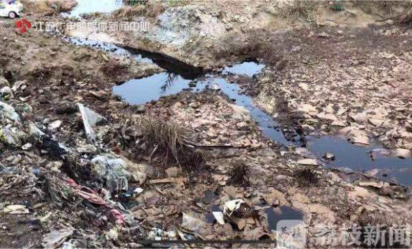 除了沒有及時填埋的垃圾,在垃圾山四周還有多道小水溝,里面流淌著黑褐色的垃圾滲濾液,這些滲濾液最終匯聚到兩個大的池塘里,散發(fā)著刺鼻的臭味。