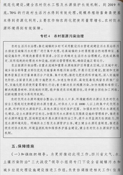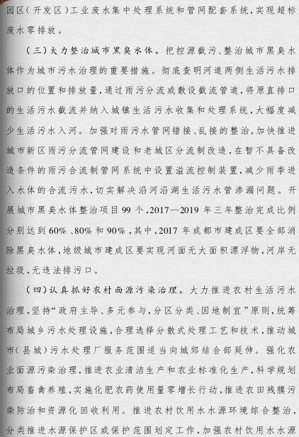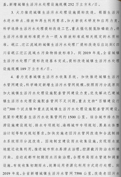 四川省政府印發(fā)了《四川省城鎮(zhèn)污水處理設(shè)施建設(shè)三年推進方案》?!斗桨浮诽岢觯衲瓿啥际薪ǔ蓞^(qū)要全部消除黑臭水體,到2019年,全省城鎮(zhèn)基本具備污水收集能力,地級及以上城市建成區(qū)黑臭水體比例控制在10%以內(nèi),全面實現(xiàn)城鎮(zhèn)污水處理設(shè)施運行規(guī)范化和監(jiān)管信息化,實現(xiàn)超標工業(yè)廢水零排放,70%的行政村生活污水得到有效處理。
