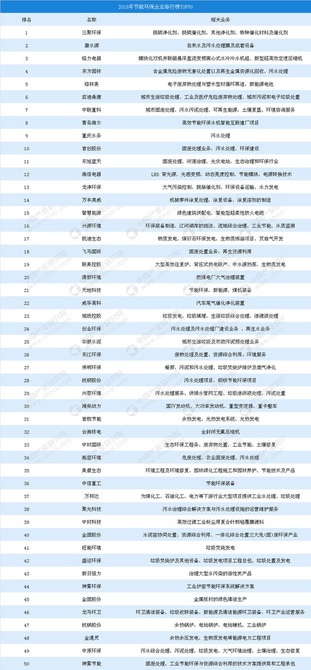 在2018年節(jié)能環(huán)保企業(yè)排行榜中,排名前十的企業(yè)分別為三聚環(huán)保、碧水源、格力電器。東方園林、格林美、啟迪桑德、中聯(lián)重科、青島海爾、重慶水務、首創(chuàng)股份。