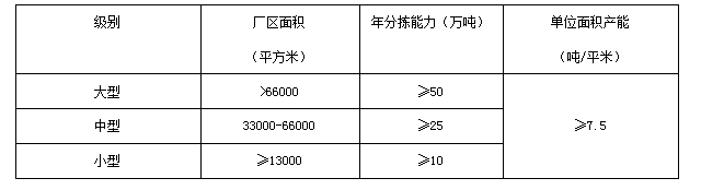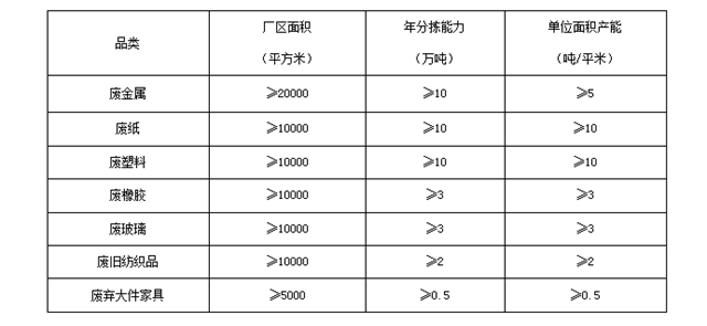 指分揀品類不少于二類,分揀能力和用地面積規(guī)劃設(shè)計,應(yīng)以再生資源分揀用地標(biāo)準(zhǔn)和本區(qū)域再生資源實際產(chǎn)生量為準(zhǔn)??煞譃榇?、中、小型三個級別,各級別綜合型分揀中心的年分揀能力和廠區(qū)面積如下: