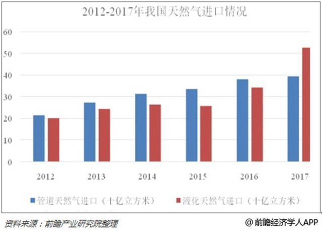 受國內(nèi)天然氣需求拉動我國天然氣進口量高速增長。進口天然氣又分為進口管道氣以及進口LNG。2017年我國管道天然氣進口量為394億立方米,進口量同比增長3.68%;液化天然氣進口量為526億立方米,同比增長 53.35%。