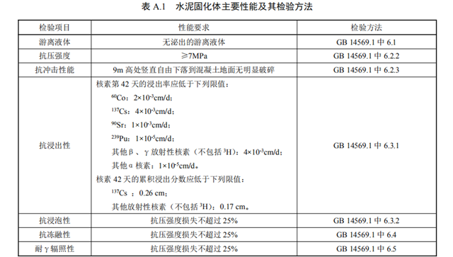 水泥固化體的性能應(yīng)滿足GB 14569.1中第5章規(guī)定的要求,參見(jiàn)附錄A。