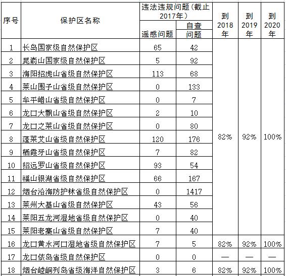 (二)自然保護(hù)區(qū)違法違規(guī)問(wèn)題。2018年底前,國(guó)家級(jí)、省級(jí)自然保護(hù)區(qū)突出問(wèn)題82%以上完成整改并開(kāi)展驗(yàn)收銷號(hào)。2019年底前,國(guó)家級(jí)、省級(jí)自然保護(hù)區(qū)突出問(wèn)題92%以上完成整改并開(kāi)展驗(yàn)收銷號(hào)。2020年底前,國(guó)家級(jí)、省級(jí)自然保護(hù)區(qū)突出問(wèn)題100%完成整改并開(kāi)展驗(yàn)收銷號(hào)。