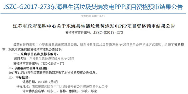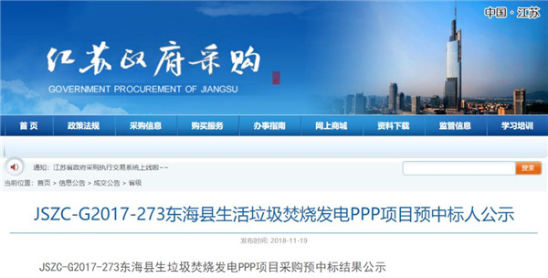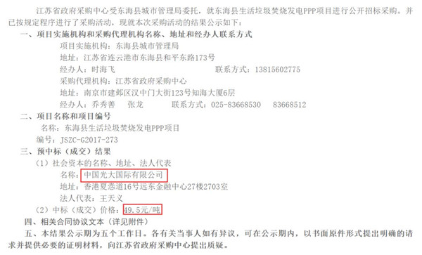 19日江蘇政府采購網(wǎng)發(fā)布了《JSZC-G2017-273東??h生活垃圾焚燒發(fā)電PPP項目預中標人公示》,公示顯示,光大國際以49.5元/噸的價格成為預中標人,相關(guān)的信息如下: