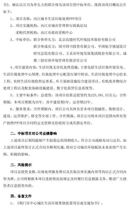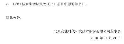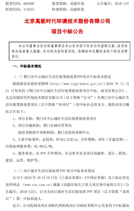 11月21日,高能環(huán)境發(fā)布公告稱(chēng),公司中標(biāo)荊門(mén)市中心城區(qū)生活垃圾焚燒處置PPP項(xiàng)目,該總投資約為5.21億元;公司為牽頭方的聯(lián)合體中標(biāo)內(nèi)江城鄉(xiāng)生活垃圾處理PPP項(xiàng)目,該項(xiàng)目估算總投資約為22.59億元。公告如下: