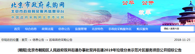 2018年11月23日,北京市朝陽區(qū)雙井街道2019年垃圾分類示范片區(qū)服務(wù)項目發(fā)布公開招標公告。