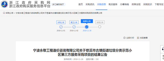 2018年11月26日,浙江省慈溪市古塘街道垃圾分類示范小區(qū)第三方服務(wù)采購項(xiàng)目發(fā)布中標(biāo)公示,中國天楹股份有限公司成為中標(biāo)的社會(huì)資本方,中標(biāo)金額為247.95萬。