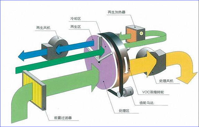 RTO系統(tǒng)的核心組成部分——沸石輪轉濃縮機(RC),可以分為處理區(qū)、再生區(qū)、冷卻區(qū)。含有VOC的被處理空氣通過過濾器后,送到濃縮轉輪的處理區(qū),VOC被吸附除去;吸附于濃縮轉輪的凈化后的空氣在再生區(qū)經熱風處理被脫附濃縮;濃縮轉卻在冷卻區(qū)被冷卻,經過冷卻后的空氣,再經加熱后作為再生空氣使用。