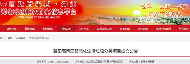 湖北襄陽高新區(qū)智慧化生活垃圾分類項(xiàng)目成交公告,浙江聯(lián)運(yùn)環(huán)境工程股份有限公司成為中標(biāo)的社會(huì)資本方,中標(biāo)金額為61.3萬,服務(wù)期限為1年。