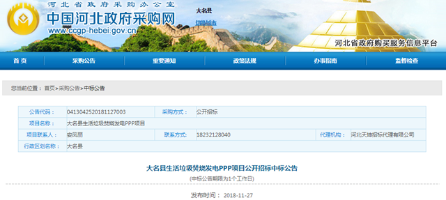2018年11月27日,河北省大名縣生活垃圾焚燒發(fā)電PPP項(xiàng)目發(fā)布中標(biāo)公告,上??岛悱h(huán)境股份有限公司成為中標(biāo)的社會(huì)資本方,垃圾處理服務(wù)費(fèi)單價(jià)為57元/噸。