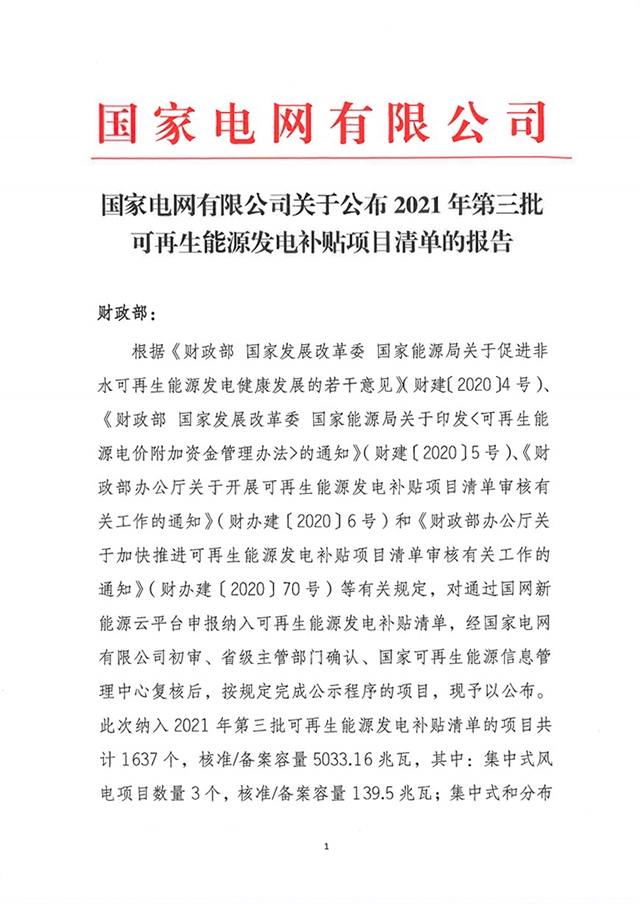 關于公布2021年第三批可再生能源發(fā)電補貼項目清單的公告 根據(jù)《財政部 國家發(fā)展改革委 國家能源局關于促進非水可再生能源發(fā)電健康發(fā)展的若干意見》(財建〔2020〕4號)、《財政部 國家發(fā)展改革委 國家能源局關于印發(fā)<可再生能源電價附加資金管理辦法>的通知》(財建〔2020〕5號)、《財政...