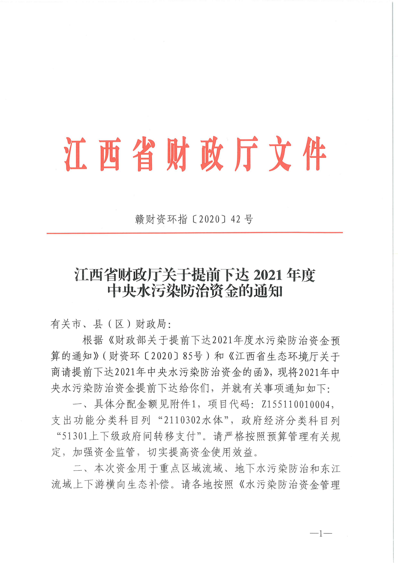 江西省財政廳關于提前下達2021年度中央水污染防治資金的通知 有關市、縣(區(qū))財政局: 根據(jù)《財政部關于提前下達2021年度水污染防治資金預算的通知》(財資環(huán)【2020】85號)和《江西省生態(tài)環(huán)境廳關于商請?zhí)崆跋逻_2021年中央水污染防治資金的函》,現(xiàn)將2021年中央水污染防治資金提前下達給你們,并...