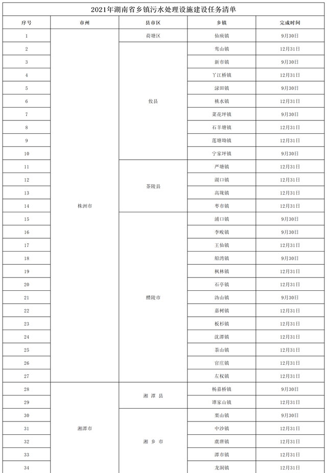 湖南省住房和城鄉(xiāng)建設(shè)廳關(guān)于《2021年湖南省鄉(xiāng)鎮(zhèn)污水處理設(shè)施建設(shè)任務(wù)清單》的公示 按照《湖南省鄉(xiāng)鎮(zhèn)污水處理設(shè)施建設(shè)四年行動(dòng)實(shí)施方案(2019-2022年)》(湘政辦發(fā)﹝2019﹞43號(hào))要求,我廳近期組織各地對(duì)2021年鄉(xiāng)鎮(zhèn)污水處理設(shè)施建設(shè)任務(wù)進(jìn)行了摸排,并對(duì)上報(bào)的計(jì)劃任務(wù)進(jìn)行了初步審核,街道、建制...