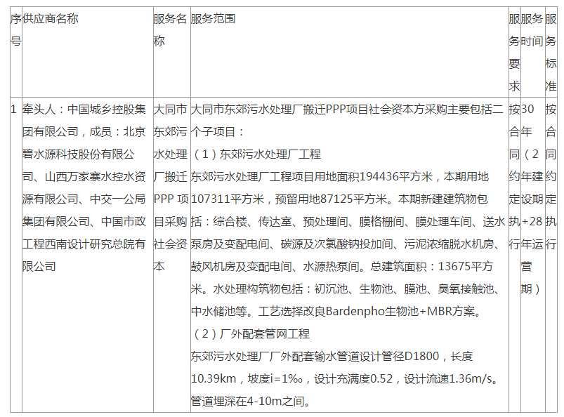 2020年11月26日,大同市西郊污水處理廠擴(kuò)容新廠PPP項(xiàng)目和大同市東郊污水處理廠搬遷PPP項(xiàng)目成交公告發(fā)布。 一、大同市東郊污水處理廠搬遷PPP項(xiàng)目 中標(biāo)(成交)信息 供應(yīng)商名稱:牽頭人:中國城鄉(xiāng)控股集團(tuán)有限公司,成員:北京碧水源科技股份有限公司、山西萬家寨水控水資源有限公司、中交一公局集團(tuán)有限...