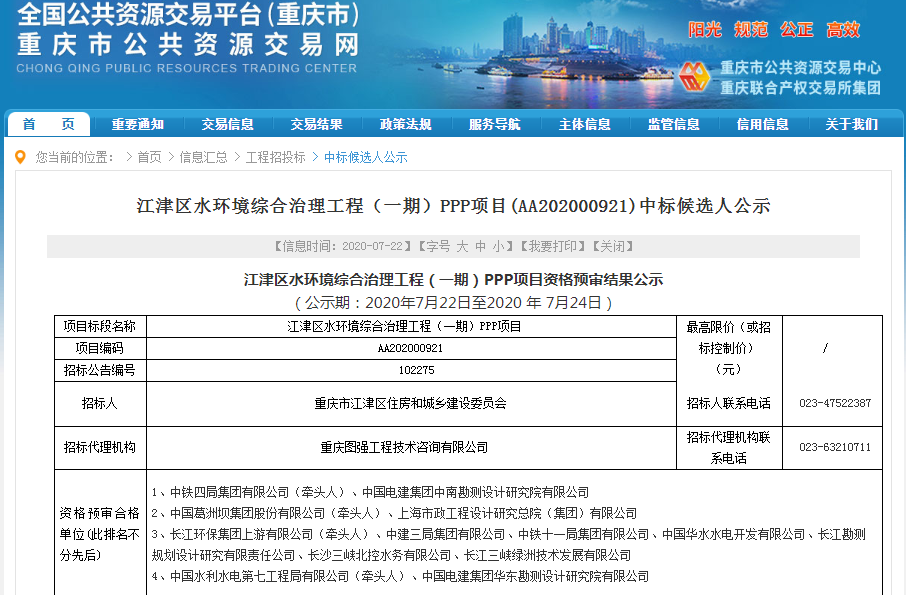 近日,重慶市江津區(qū)水環(huán)境綜合治理工程(一期)PPP項(xiàng)目資格預(yù)審結(jié)果公布,共4家聯(lián)合體入圍,分別是: 1、中鐵四局集團(tuán)有限公司(牽頭人)、中國電建集團(tuán)中南勘測設(shè)計(jì)研究院有限公司 2、中國葛洲壩集團(tuán)股份有限公司(牽頭人)、上海市政工程設(shè)計(jì)研究總院(集團(tuán))有限公司 3、長江環(huán)保集團(tuán)上游有限公司(牽頭人)、...