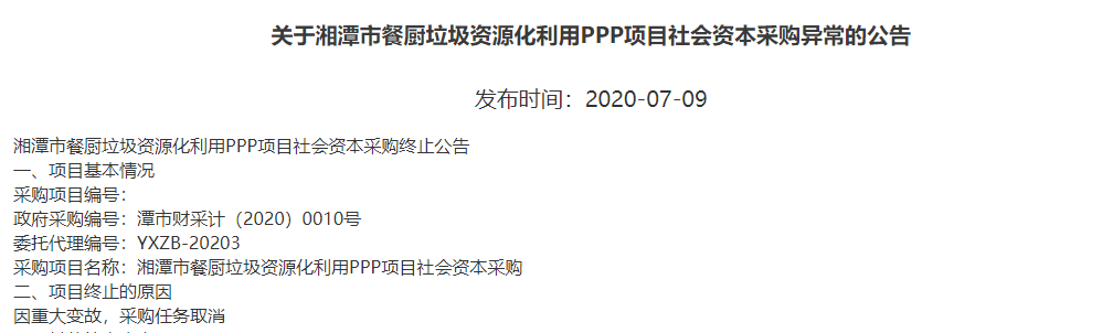 7月9日,湘潭市餐廚垃圾資源化利用PPP項(xiàng)目發(fā)布采購終止公告,據(jù)公告顯示,該項(xiàng)目因重大變故,采購任務(wù)取消,具體原因尚未透露。據(jù)招標(biāo)文件顯示,該項(xiàng)目總投資為27307.52萬元。 項(xiàng)目內(nèi)容:本項(xiàng)目包括餐廚垃圾綜合處理車間、糞渣處理車間、污水綜合處理車間、門房、門房及地磅房、厭氧罐、沼氣凈化基礎(chǔ)、沼氣柜...