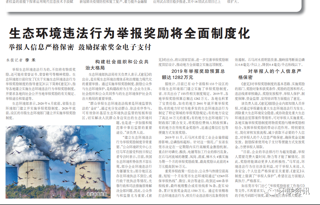 文章導(dǎo)讀生態(tài)環(huán)境部表示,2020年6月底前,省級生態(tài)環(huán)境部門建立并實施舉報獎勵制度。2020年底前,設(shè)區(qū)的市級生態(tài)環(huán)境部門建立并實施舉報獎勵制度。舉報生態(tài)環(huán)境違法行為的,不但將有物質(zhì)獎勵,還可能有榮譽證書、榮譽稱號等精神獎勵。生態(tài)環(huán)境部日前印發(fā)了《關(guān)于實施生態(tài)環(huán)境違法行為舉報獎勵制度的指導(dǎo)意見》(以...