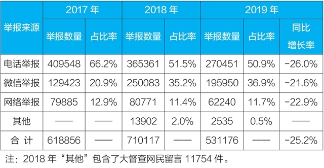 2019年,全國“12369環(huán)保舉報聯(lián)網(wǎng)管理平臺”(以下簡稱“聯(lián)網(wǎng)平臺”)共接到公眾舉報531176件,同比下降25.2%。所有舉報中,電話舉報270451件,微信舉報195950件,網(wǎng)絡(luò)舉報62240件,其他渠道2535件,其中電話舉報下降26.0%...