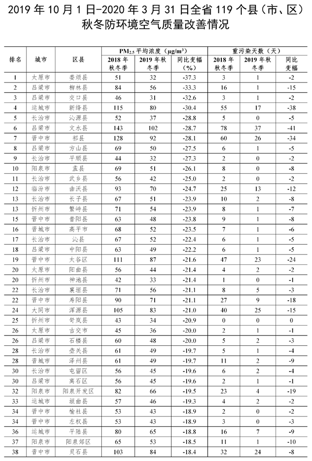 近日,山西省大氣污染防治工作領(lǐng)導(dǎo)組辦公室通報(bào)了2019年10月1日-2020年3月31日秋冬防期間,全省各縣(市、區(qū))環(huán)境空氣質(zhì)量改善情況。 全省各縣(市、區(qū))環(huán)境空氣質(zhì)量改善情況較好的是: PM2.5平均濃度由低到高排名前十位的縣(市、區(qū))依次為交口縣(31μg/m3)、五寨縣(31μ...