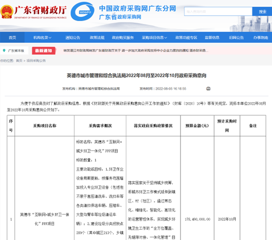 圖片來源:廣東省政府采購廣東省政府采購網(wǎng)消息,近日,英德市城市管理和綜合執(zhí)法局發(fā)布2022年08月至2022年10月政府采購意向,英德市“互聯(lián)網(wǎng)+城鄉(xiāng)環(huán)衛(wèi)一體化”PPP項目計劃于2022年10月份開展政府采購。采購需求概況:1.環(huán)衛(wèi)作業(yè)設(shè)備周期更新,按服務(wù)范圍增加投入專業(yè)環(huán)衛(wèi)設(shè)備(包括但不限于高壓清...