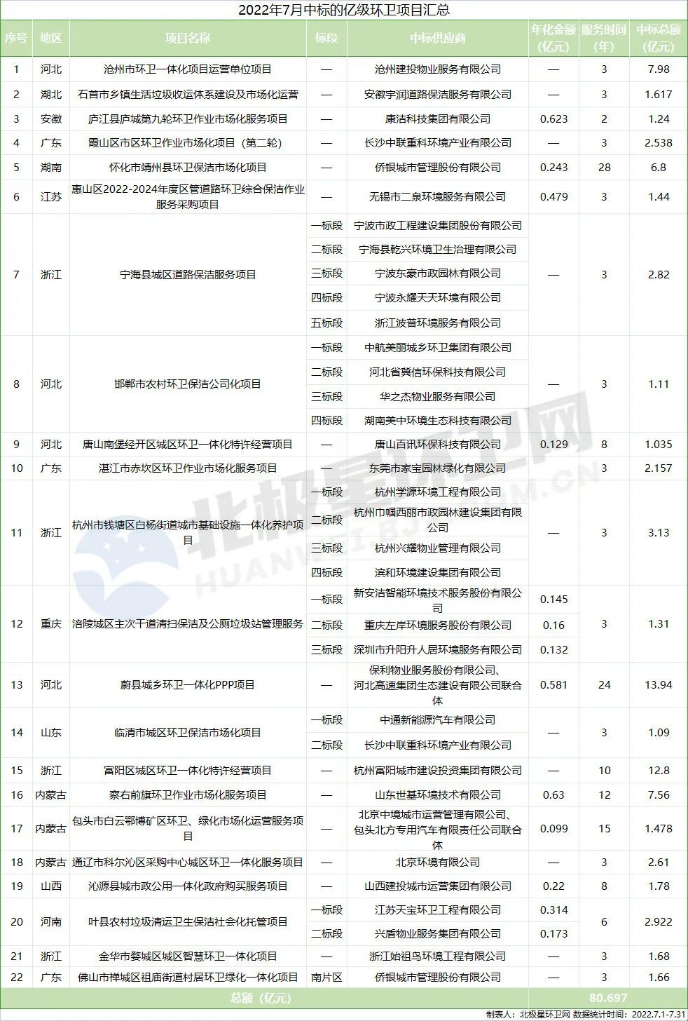 7月共開出2個10億+項目,分別是13.94億元的河北蔚縣城鄉(xiāng)環(huán)衛(wèi)一體化PPP項目和12.8億元的浙江富陽區(qū)城區(qū)環(huán)衛(wèi)一體化特許經(jīng)營項目,這兩個項目分別被保利物業(yè)、河北高速聯(lián)合體以及杭州富陽城投收入囊中。項目匯總?cè)缦拢?1 河北、浙江、廣東三地仍然領(lǐng)先內(nèi)蒙古地區(qū)異軍突起眾所周知,河北、浙江、廣東地區(qū)環(huán)...