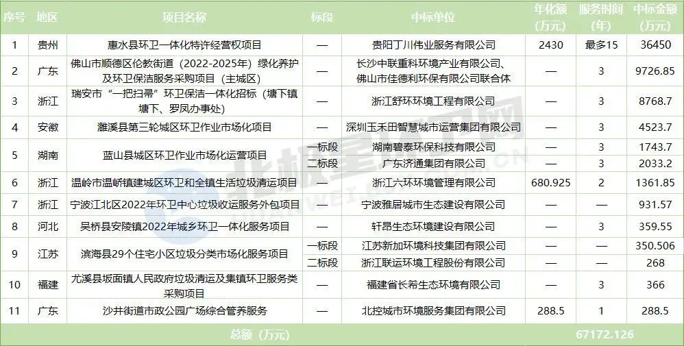 詳情如下:項目名稱:貴州省惠水縣環(huán)衛(wèi)一體化特許經(jīng)營權(quán)項目中標(biāo)單位:貴陽丁川偉業(yè)服務(wù)有限公司中標(biāo)金額:2430萬元/年,最高36450萬元服務(wù)時間:8+N(N最少不低于2年,最高不超過7年)服務(wù)內(nèi)容:特許經(jīng)營范圍包括約291萬平方米的城市各級道路及好花紅景區(qū)的日常清掃保潔,9個轉(zhuǎn)運站的維護(hù)管理,城市建...