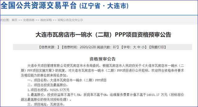 源于大連市公共資源交易管理辦公室日前公開消息稱,大連市瓦房店市一碗水(二期)PPP項(xiàng)目正式進(jìn)入公開招標(biāo)環(huán)節(jié)。 招標(biāo)公告顯示,該項(xiàng)目包括瓦房店市八一水庫、瓦房店市九龍水庫、瓦房店市蓮花水庫、瓦房店市大河水庫、瓦房店市永寧鎮(zhèn)水務(wù)中心和瓦房店市復(fù)州城鎮(zhèn)自來水公司,共四個水庫和兩個凈水廠。 項(xiàng)目合作期限達(dá)2...