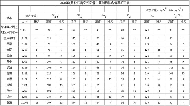 根據(jù)省生態(tài)環(huán)境監(jiān)測(cè)中心提供的數(shù)據(jù),現(xiàn)將2020年1月各設(shè)區(qū)市環(huán)境空氣質(zhì)量排名情況通報(bào)如下: 一、1月份環(huán)境空氣質(zhì)量排名情況 11個(gè)設(shè)區(qū)市中,僅呂梁市環(huán)境空氣質(zhì)量綜合指數(shù)好于京津冀及周邊地區(qū)平均水平,其余10市均差于京津冀及周邊地區(qū)平均水平。環(huán)境空氣質(zhì)量綜合指數(shù)最好的3個(gè)城市依次是:呂梁、大同、陽(yáng)泉,...