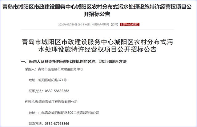 截圖源于中國政府采購網(wǎng) 2月20日,來自青島城陽區(qū)的農(nóng)村分布式污水處理設(shè)施特許經(jīng)營權(quán)項目在中國政府采購網(wǎng)公布招標(biāo)公告。 為盡快農(nóng)村污水處理設(shè)施這一重要市政建設(shè)重要“短板”,該項目建設(shè)范圍覆蓋青島城陽區(qū)27 個社區(qū)(村),涉及居民共12964戶,具體包括:城陽區(qū)夏莊街道南屋石、...
