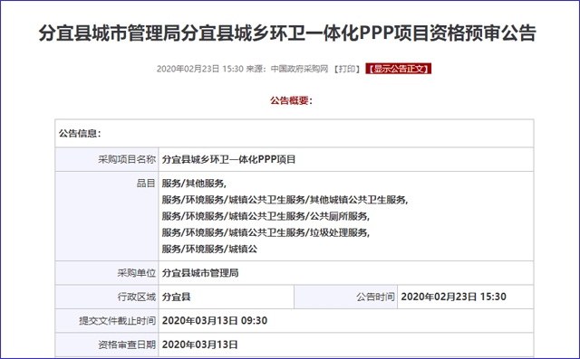 截圖源于中國政府采購網(wǎng) 9.99億元!時間來到2020年,投資體量動輒逾億元的環(huán)衛(wèi)項目頻頻亮相。源于中國政府采購網(wǎng)2月23日公開消息稱,江西新余分宜縣城鄉(xiāng)環(huán)衛(wèi)一體化PPP項目(編號:HJGC-2020-FY-001)公布招標(biāo)公告。 本項目服務(wù)區(qū)域本項目覆蓋分宜縣下轄的7個鎮(zhèn)、3個鄉(xiāng)、2個街道,覆蓋人...