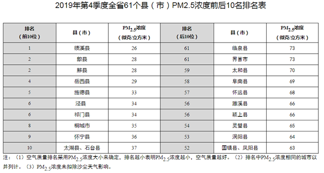 為貫徹落實(shí)國(guó)務(wù)院《大氣污染防治行動(dòng)計(jì)劃》、《安徽省打贏藍(lán)天保衛(wèi)戰(zhàn)三年行動(dòng)計(jì)劃實(shí)施方案》有關(guān)要求,加強(qiáng)信息公開和社會(huì)監(jiān)督,推動(dòng)城市空氣質(zhì)量改善,按照原環(huán)保部統(tǒng)一部署及省生態(tài)環(huán)境廳工作要求,近日,安徽省生態(tài)環(huán)境監(jiān)測(cè)中心完成《2019年第4季度全省61個(gè)縣(市)PM2.5濃度前后10名排名表》編制發(fā)布工作...