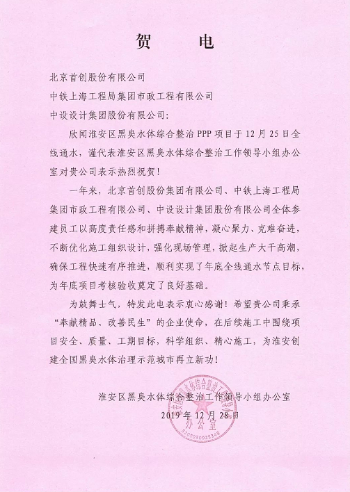 寒冬臘月,2020辭舊迎新之際,一封來自淮安區(qū)黑臭水體綜合整治工作領(lǐng)導(dǎo)小組辦公室的賀電,在高度肯定和贊揚之余,更給首創(chuàng)股份,以及淮安首創(chuàng)團隊帶來了一絲暖意。 賀電中,整治辦對首創(chuàng)股份、淮安首創(chuàng)生態(tài)環(huán)境有限公司及堅持奮戰(zhàn)在一線的同事們表示誠摯的敬意和衷心的感謝,并就項目給予了首創(chuàng)股份很高的期望。 地處...