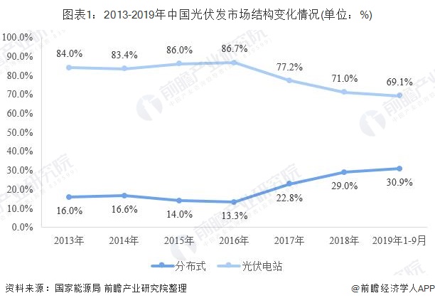 我國光伏發(fā)電行業(yè)在經(jīng)歷了2013-2017年的高歌猛進之后,在2018年經(jīng)歷了行業(yè)低谷,531政策的急剎車使得國內(nèi)市場快速下滑、產(chǎn)品價格快速下降、企業(yè)盈利能力持續(xù)位于低位,行業(yè)發(fā)展熱度驟降。但是,受政策影響,行業(yè)逐步由過去的粗放式增長、追求規(guī)模向精細(xì)化發(fā)展、追求質(zhì)量轉(zhuǎn)變。 分布式市場份額穩(wěn)步提升 我...