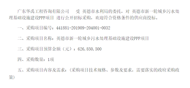 高達626850500元!這是位于廣東英德市的新一輪城鄉(xiāng)污水處理基礎(chǔ)設(shè)施建設(shè)PPP項目(采購項目編號:441881-201909-204001-0032)帶來的投資體量。 根據(jù)中國政府采購網(wǎng)的公告顯示,本項目共新建鄉(xiāng)鎮(zhèn)生活污水處理設(shè)施22座,設(shè)計總規(guī)模為20100 m3/d;新建DN300-DN12...