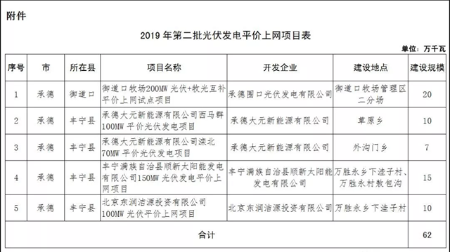 近日,河北省發(fā)布2019年第二批光伏發(fā)電平價上網(wǎng)項目計劃的通知,其中包括五個項目,建設(shè)規(guī)模共計62萬千萬時。詳情如下: 河北關(guān)于下達2019年第二批光伏發(fā)電平價上網(wǎng)項目計劃的通知 冀發(fā)改能源[2019] 1831號 承德市發(fā)展改革委,國網(wǎng)冀北電力有限公司: 按照國家發(fā)展改革委、國家能源局《關(guān)于積極推...
