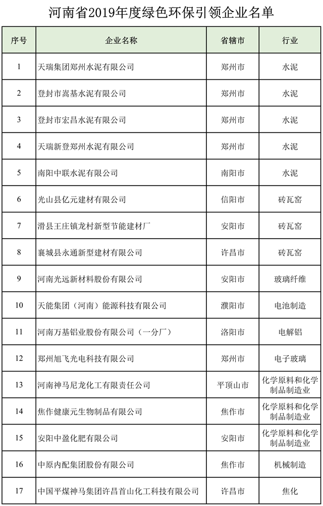 根據(jù)《河南省綠色環(huán)保調(diào)度制度實施方案(試行)》(豫環(huán)文〔2018〕280號),省生態(tài)環(huán)境廳、省發(fā)展改革委、省工業(yè)和信息化廳、省財政廳、省金融辦等部門,組織相關(guān)行業(yè)、領(lǐng)域?qū)<遥瑢Ω魇≥犑型扑]申報的2019年度綠色環(huán)保引領(lǐng)企業(yè)進行了資料復(fù)核、現(xiàn)場核驗、集中評選,確定了2019年度綠色環(huán)保引領(lǐng)企業(yè)名單,現(xiàn)...